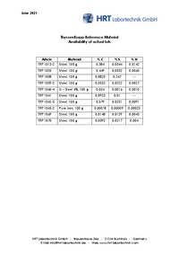 June 2021 ThyssenKrupp Reference Material Availability of actual lots Article TRP 1013-2 Material Steel, 100 g %C 0,384 %S 0,0344 %N 0,0142 TRP 1020 Steel, 100 g 0,449 0,0332 0,0063 TRP…